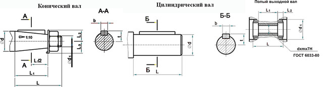 | Вихідні кінці валів | L | L1 | L2 | L3 | b | d | d1 | t | m | |