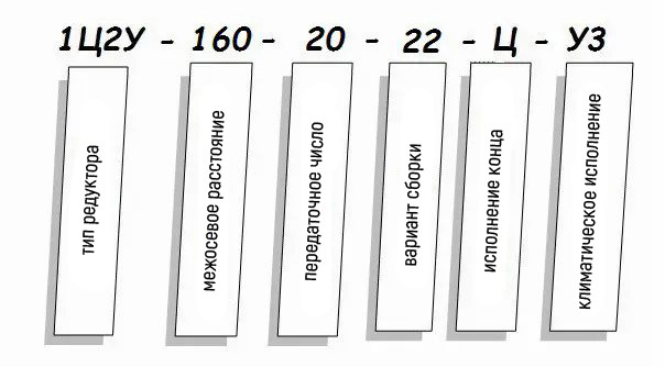 Редуктор 1Ц2У-160-20-22 може мати вказану в даному типорозмірі складання номер 22, для якого характерне колінеарне розташування валів, розміщених у корпусі паралельно один одному.