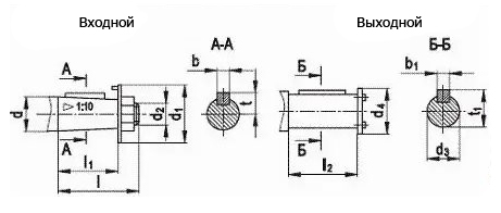 | Типорозмір редуктора, мм | d | d1 | d2 | l | l1 | b | t | d3 | d4 | l1 | b1 | t1 |