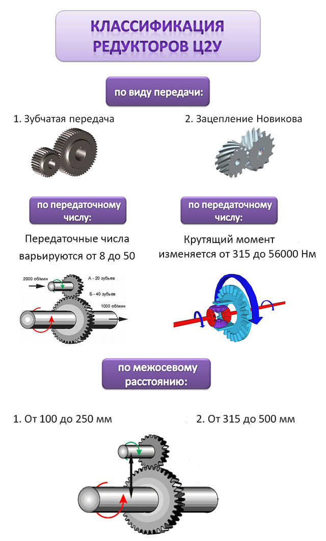 Усі редуктори типу Ц2У можна класифікувати за такими пунктами: