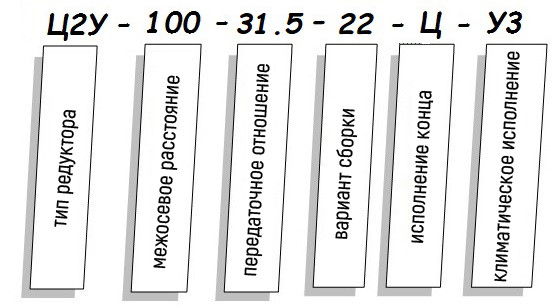 Редуктор Ц2У-100-31.5-22 в даному типорозмірі має складання 22, що видно з умовного позначення. Це один із найбільш затребуваних варіантів, що використовуються на сучасних виробничих лініях. Він характеризується паралельним колінеарним виведенням кінців валів (вхідного та вихідного), що потрібно для приєднання одного електричного двигуна та одного виконавчого механізму. Інші варіанти складання, властиві для редукторів даного типу, можна побачити у ГОСТ 20373-94.