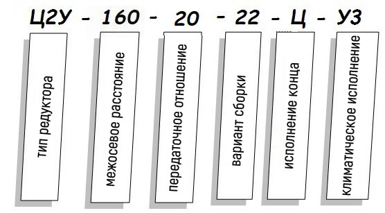 Редуктор Ц2У-160-20-22 має складання 22, що зазначено у типорозмірі пристрою. Це говорить про те, що механізм може бути приєднаний до електричного двигуна та одного виконавчого механізму.