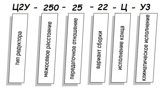 Варіант складання редуктора Ц2У-250-25-22 вказується у його типорозмірі та має бути визначений у момент замовлення. Описуваний механізм має складання 22 з паралельним виведенням кінців валів. Форма завершальних частин тихохідного і швидкохідного валу не залежить від складання, її ви можете вибрати, виходячи з особливостей конструкції, що організується.