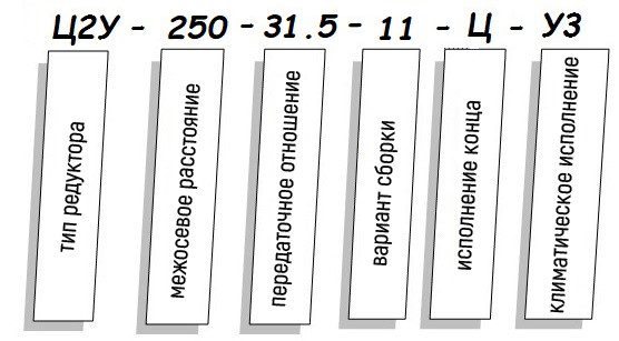 Редуктор Ц2У-250-31.5-11 використовує циліндричну передачу для отримання необхідних для роботи системи механічних параметрів. Редукування частоти обертання здійснюється за рахунок залучення двох ступенів циліндричного зачеплення. Перетворювач має горизонтальне виконання. Його корпус виробляється литим з чавуну, в окремих випадках - алюмінію.