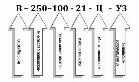 Редуктор В-250-100 виконується з міжосьовою відстанню 250 мм та передатним числом 100i. Корпус його виготовлений із чавуну, а загальна маса дорівнює 360 кг.