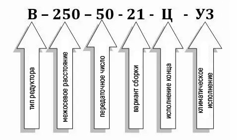 Конструкційно редуктор В-250-50 складається з триступінчастого механізму з паралельно розташованими осями. Все це розташоване у чавунному корпусі. При бажанні матеріал корпусу можна змінити.